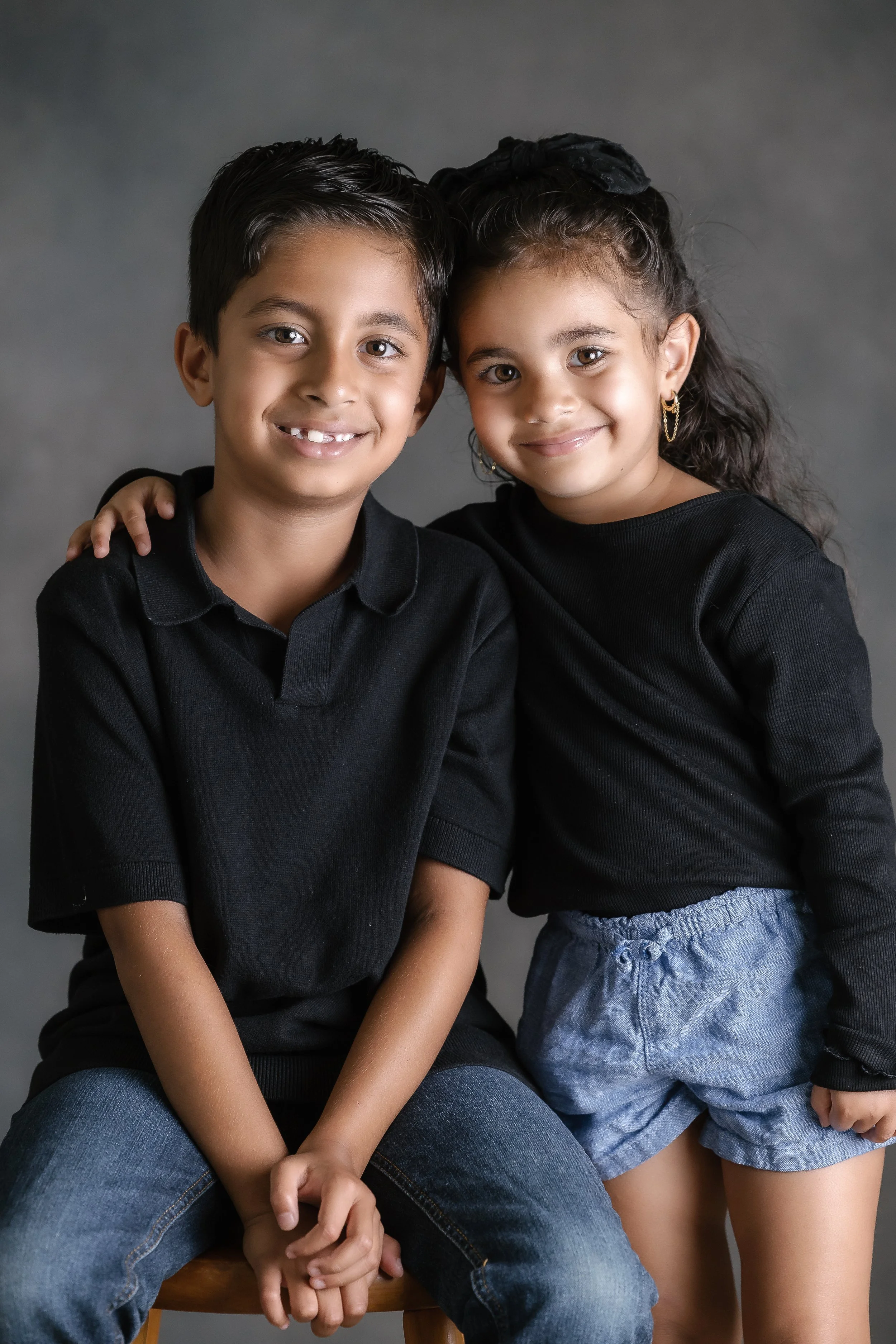 A relaxed, easy, and fun experience on a soft grey backdrop, perfect for capturing a variety of beautiful poses and natural expressions.